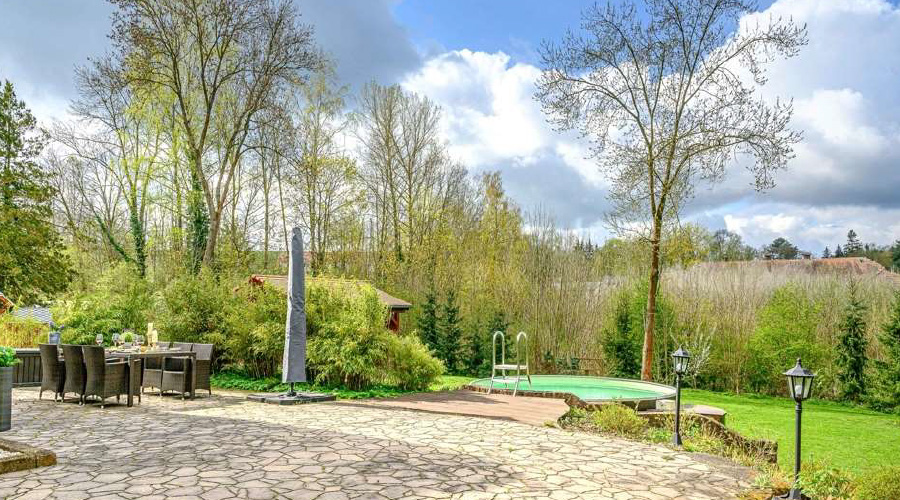 - Ein weitläufiger Garten mit einem erfrischenden Pool, ideal für festliche Anlässe im Freien
